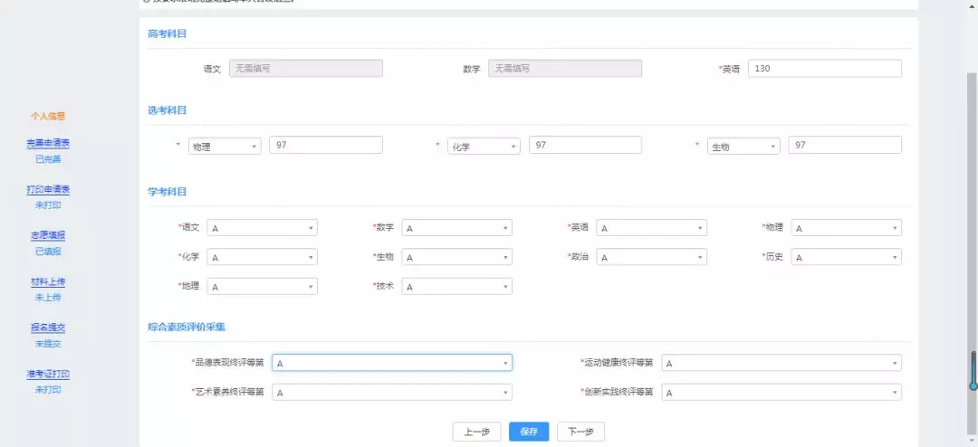 (2)『 学考成绩 』:十门科目都必须在C等以上。