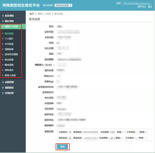 (1)若之前在“阳光高考特殊类型招生报名平台”参加过其他项目的报名,则系统中会保存有之前填报的个人信息,请仔细核对,确认无误后进行下一步骤。