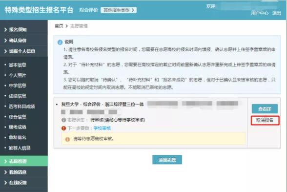 (12)若填报完成仍需修改志愿,请回到志愿管理,取消报名后重新填报志愿。再次报名会改变报名号,新生成的报名表需重新签字盖章。请注意报名截止时间。