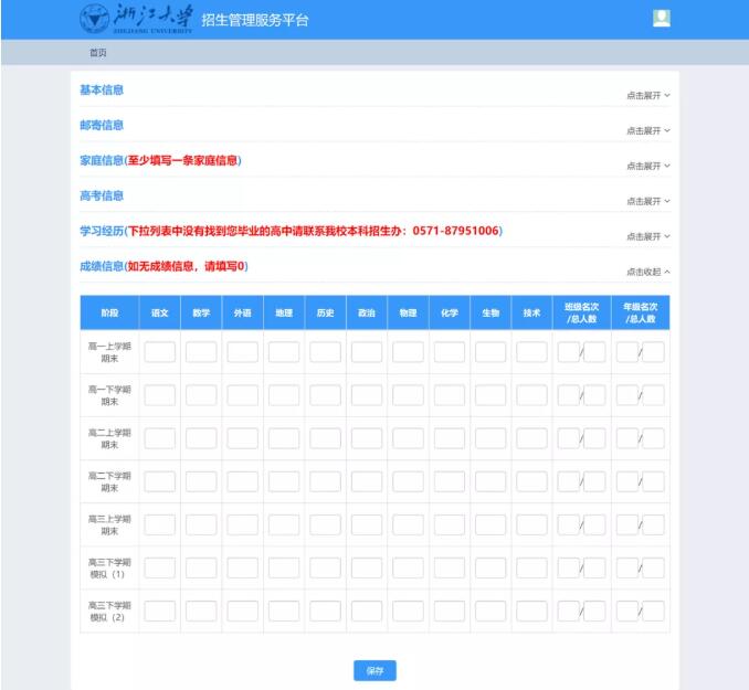 8、成绩信息填写。考生按照要求准确填写高中期末真实考试成绩及班级、年级名次。信息填写完成后点击保存。