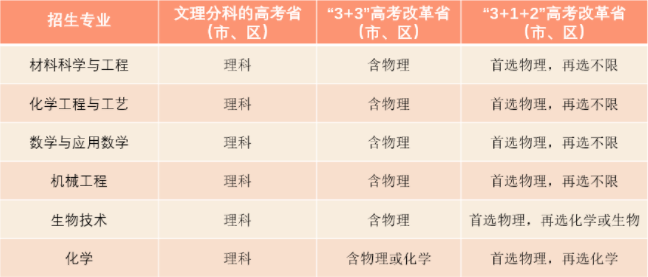 学校各专业课程均采用英语教学。对于报考材料科学与工程、化学工程与工艺、生物技术、机械工程、化学等本科专业的考生,高考外语及数学单科成绩须同时满足下列2个条件:(1)高考外语单科成绩须不低于100分(满分150分),(2)高考数学单科成绩须不低于80分(满分150分)。