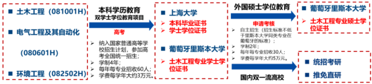 上海大学里斯本学院共开设土木工程、电气工程及其自动化、环境工程三个专业,是由里斯本大学的三个优势工程学科和上海大学的三个国家级一流本科专业建设点强强联手,共同打造的,旨在通过高水平国际交流,引进欧洲标准的优质工程类教育资源,培养具有全球视野、一流学术背景和广阔就业前景的卓越工程人才,打造国际化高层次复合型创新人才培养基地,切实服务国家一带一路倡议。