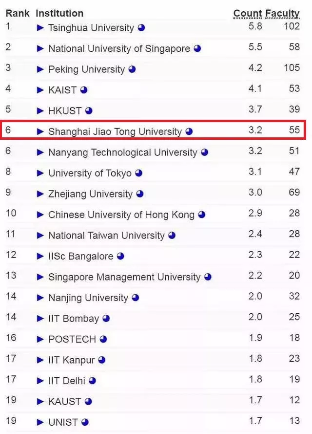 亚洲地区的高校排名中,前六名分别为:清华大学、新加坡国立大学、北京大学、韩国科学技术院、香港科技大学、上海交通大学。