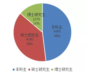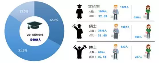 浙江大学2017届毕业生共11428人,本科生与研究生比例分别为48.1%和51.9%,男生占比较女生略多。