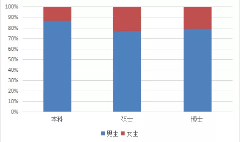 中科大的男女比例差距最为悬殊,毕业生男女比例为3.99:1。本硕博男女分布如下表: