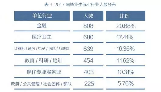 2017届毕业生从事金融业的最多,从事医疗行业和互联网业的毕业生也占比颇大。从事以下五个行业的毕业生占据2017年毕业生总人数的76.38%。