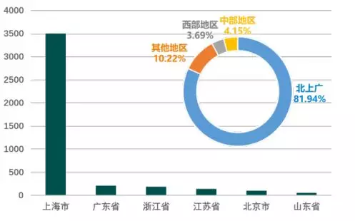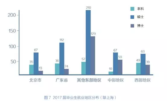 除上海外,北京市和广东省是复旦毕业生的主要去向,去往中部地区和西部地区的数量较少。