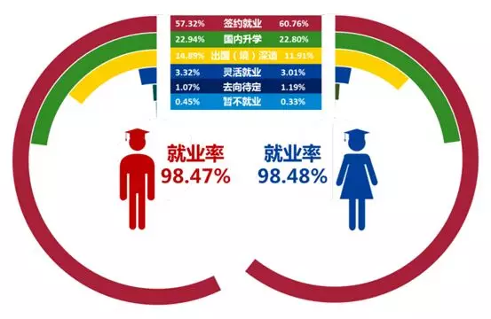 男女生就业率和毕业去向整体差别不大,相对来说,女生选择就业的比重稍高(60.76%>57.32%),而选择出国深造的男生比女生稍多。
