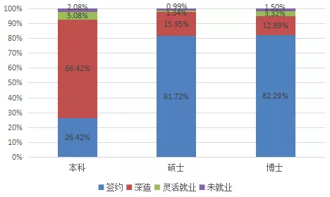 从本科生、硕士生及博士生三个群体分别来看,大部分(66.42%)本科生选择继续读书,而硕士生和博士生选择深造的较少。上交与大部分顶尖高校不同的一点是,深造的硕士生比例相对其他学校较高(15.95%),而博士生深造的比重是最低的。
