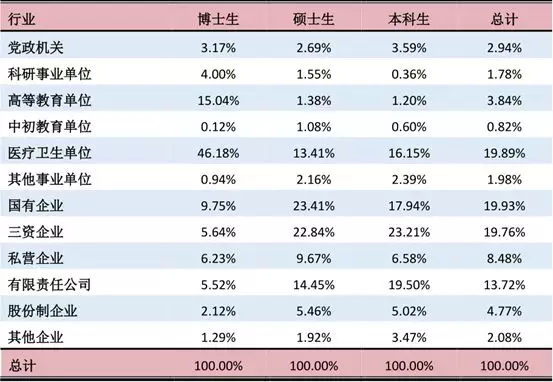 2017届浙大不同学历毕业生就业的单位性质略有差别。在事业单位就职的毕业生比例随着学历升高而增大,博士生与硕士生和本科生差距尤其明显。60%左右的博士生选择在事业单位就业。这其中,在医疗卫生单位和高等教育单位就业的比重尤其大。