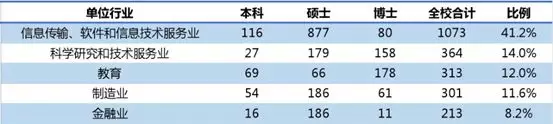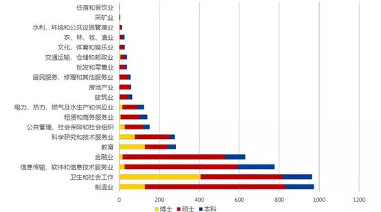 从事互联网行业的毕业生占据了就业总数的将近一半,其次是科研行业、教育行业、制造业和金融业。中科大毕业生从事金融业的比例远远低于其他顶尖高校。