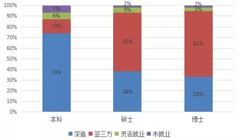 选择深造的毕业生比例随学历升高而减少,而签三方就业的毕业生比例随学历升高而增大。选择继续深造的本科生比重最高(74%),硕士生中选择继续深造的占硕士生总数的38%,相对本文其他高校来说,中科大的这个数据算是很高的了。