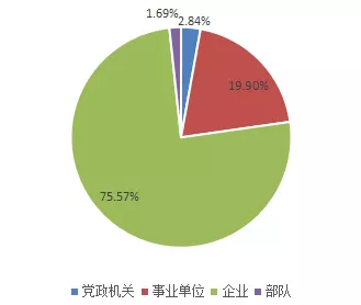 2017届选择就业的毕业生去往企业的占绝大多数(75.57%),其次是事业单位(19.90%)。