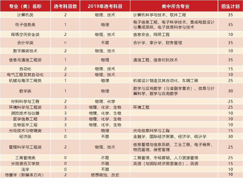 2019年杭州电子科技大学为使考生有更多专业的选择机会,在招生专业设置上涵盖学校多个国家级特色专业及信息经济相关、省重点建设专业。如会计学类、计算机类、电子信息类、信息与通信工程类、网络空间安全类等22个专业(类),其中有些2018年以大类招生的专业,2019年以专业单独招生。
