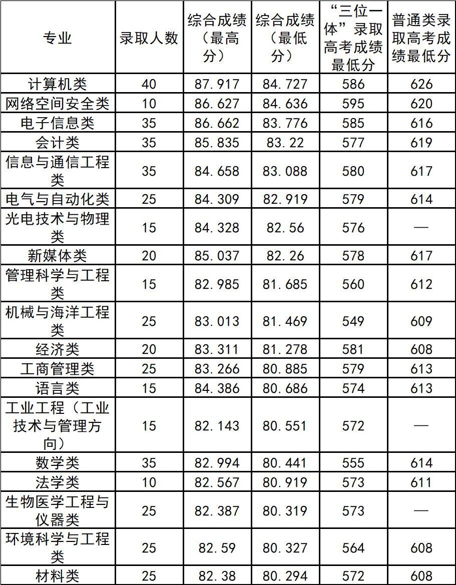 2018年杭电三位一体各专业录取情况如下图所示,三位一体录取高考成绩最低分比裸分高考成绩录取低了40分左右,且光电技术与物理类、工业工程和生物医学工程与仪器类专业只是通过三位一体来招生录取的。