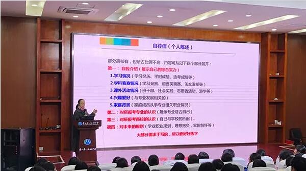 随后,屠处长先为学生们讲解了高校的几大分类,再到高考的四种主要途径,并为学生们该如何选择大学“出谋划策”。他提出了六个建议,包括学校知名度、专业设置、地理位置、交通情况、校园情况、周边配套设施等,提高了学生们在选择高校时的全面性。