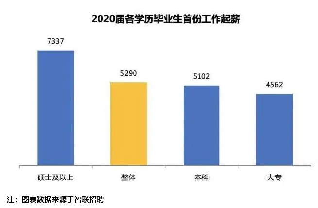 根据智联招聘平台的大数据,2020届毕业生首份工作平均起薪为5290元/月,薪资与学历高低成正比。