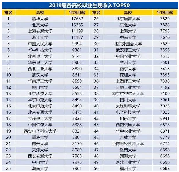 对2019届不同高校毕业生的平均月薪进行追踪发现,毕业生收入高低与其毕业院校的等级形成强关联,收入排行前50名的高校多为双一流/211/985类大学。