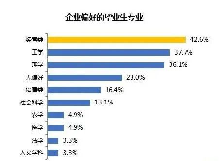 学科类型方面,企业对于经管类毕业生的偏好比例最高,占比42.6%,其次为工学占比37.7%,理学占比36.1%。