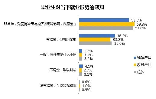 疫情对经济大环境的影响下,毕业生对当下就业形势的感知并不乐观,57.8%的毕业生认为就业形势“非常难,受疫情冲击与经济波动等影响”,认为“有难度,但可以接受”的毕业生占比35%。