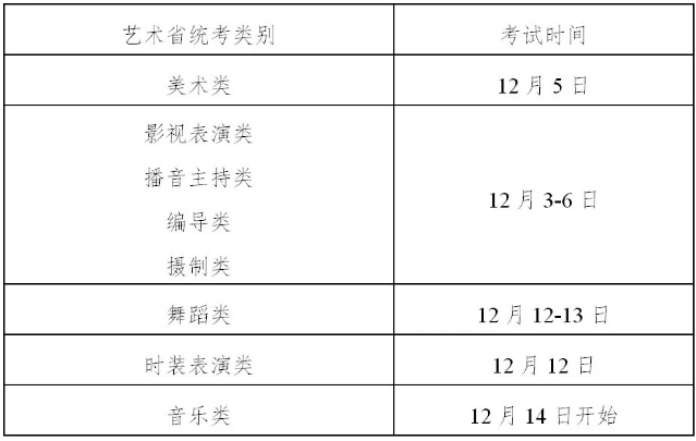 艺术类专业考试包括省统一组织的专业考试和高校组织的专业考试两种形式。艺术类省统考分8类,即:美术类、音乐类、舞蹈类、时装表演类、影视表演类、播音主持类、编导类、摄制类。考生须选择相应的省统考类别(可多选),并同时填选相关信息,完成省统考报考手续。我省艺术类专业省统考在2020年12月陆续展开,具体时间安排见下表: