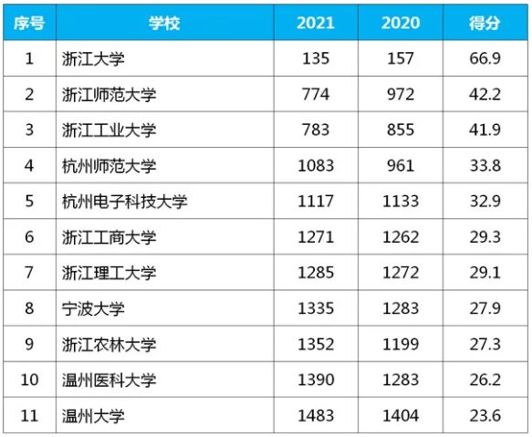 值得注意的是,浙江也有11所高校进入榜单,部分高校排名较去年有所提升,具体请看——