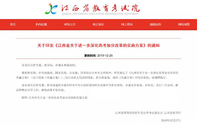 2019年12月17日,江西省印发《江西省关于进一步深化高考加分改革的实施方案》,其中规定,对经省政府批准的民族乡(贵溪市樟坪畲族乡等8个民族乡)和按法定程序批准且经省有关部门向社会公示的民族村(铅山县陈坊乡长寿畲族村等82个民族村),少数民族考生加分政策实行3年过渡期,即2020-2022年过渡期内加5分不变,自2023年开始不再加分。