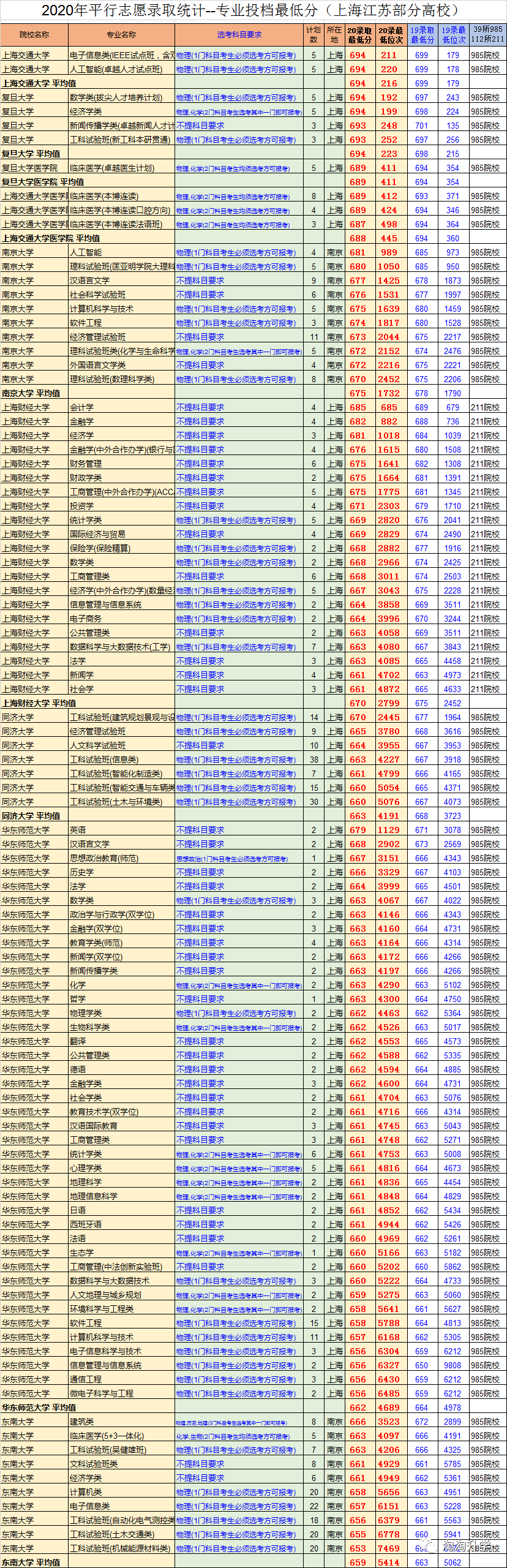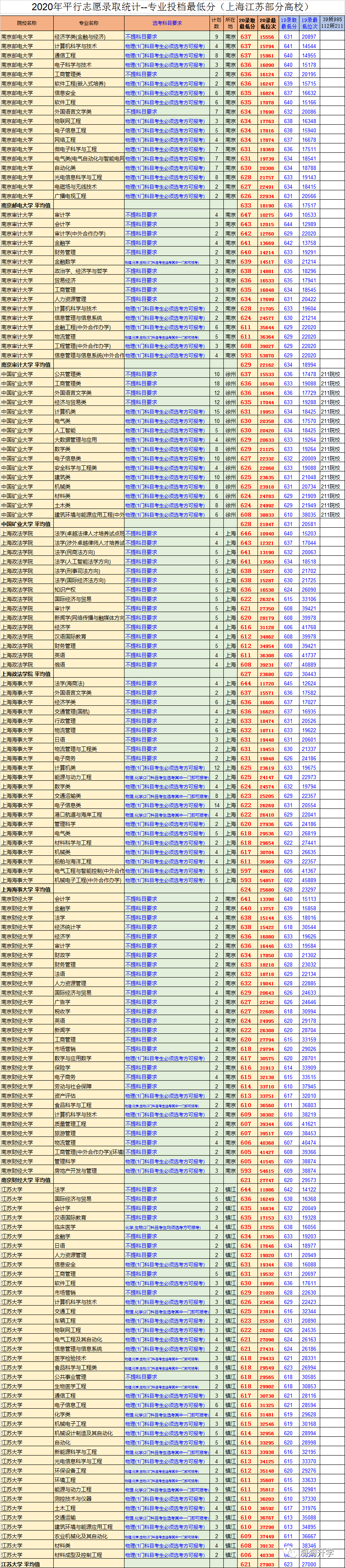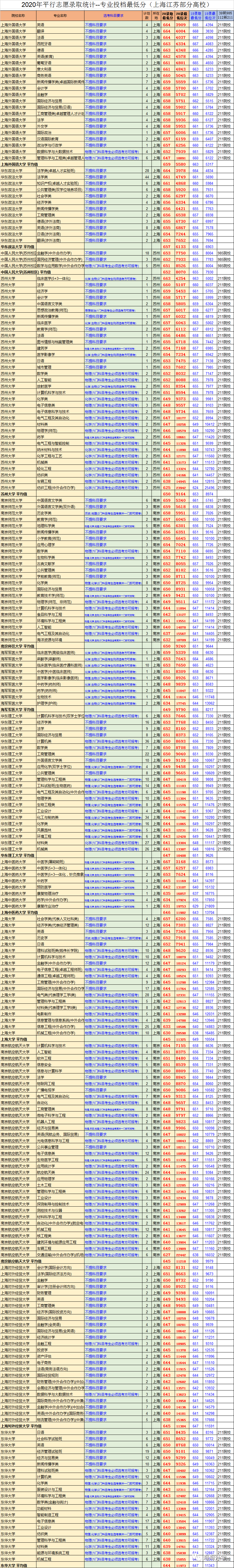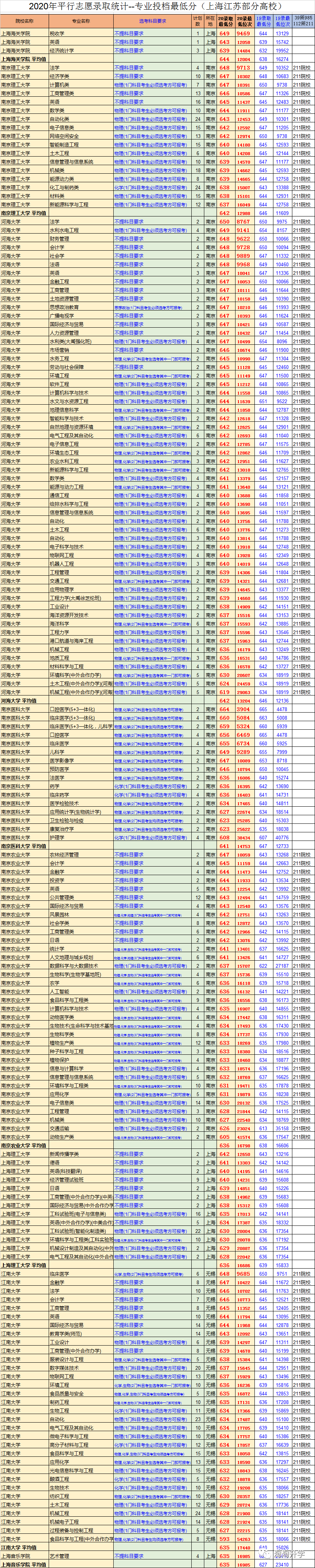因为篇幅的问题,我们只展示了学校平均投档线620分以上的高校。上海交大要694分以上,负担要693分以上,他们的医学院录取分数略低一些。南京大学要670分以上,上海财经大学的热门专业要680分以上,同济大学文科最低分664,理科最低分660。