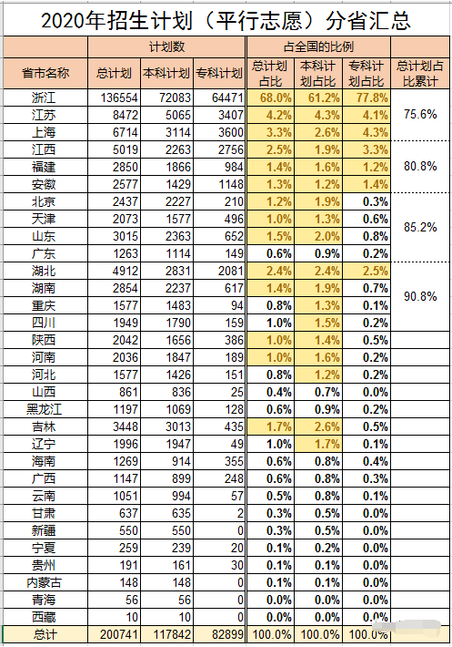 2020年在浙江招生的高校,浙江省内高校招生人数最多,占比68%。招生人数排第二第三的分别是江苏和上海,分别占4.2%和3.3%。江浙沪三省高校的招生数占浙江招生总数的75.6%,这三地也是浙江考生首选的三个目标省份。所以了解一下江苏和上海的录取情况,很有必要。2020年普通类平行志愿中,各省市的招生计划汇总如下: