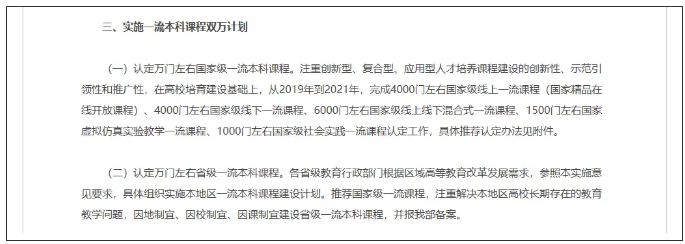 据了解,2019年10月30日,教育部发布《教育部关于一流本科课程建设的实施意见》,要求实施一流本科课程“双万计划”,认定万门左右国家级一流本科课程。