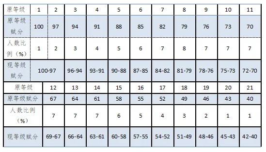 注意:从2022年1月选考起,选考科目等级赋分的分差由3分改为1分。在原21等级基础上划分为20个赋分区间,将原第1(1%,100分)、第2(2%,97分)两个等级合并为一个赋分区间,其余不变。各对应区间内按等比例转换,四舍五入将卷面得分转换为等级分。