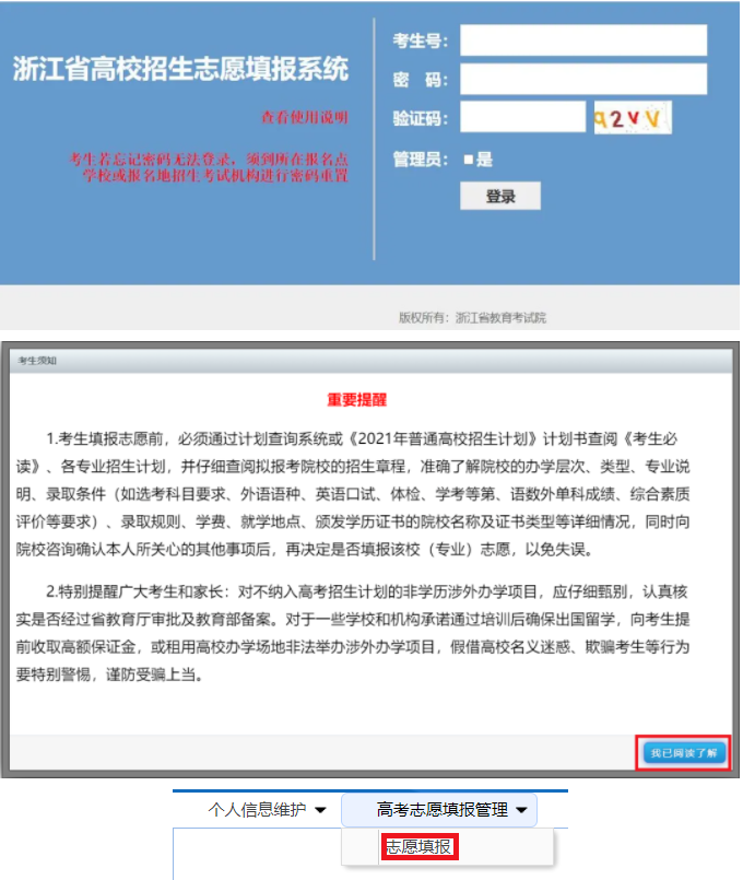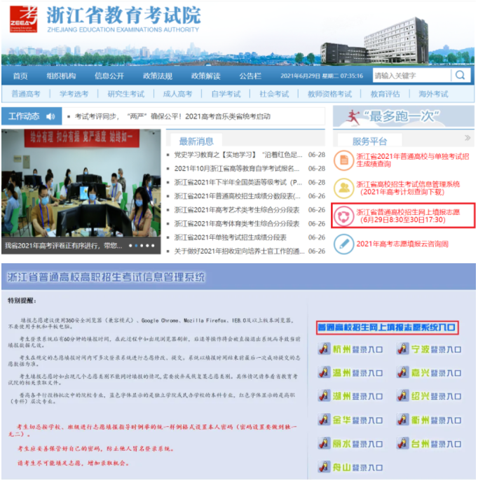 登录浙江省教育考试院网站:www.zjzs.net ,点击进入"浙江省普通高校招生网上填报志愿"系统,之后再选择自己的地市进入登录界面。
