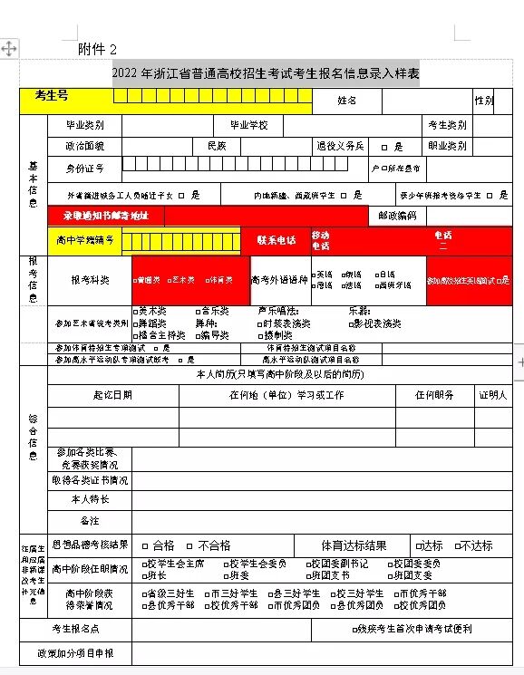 2022浙江高考报名信息录入样表和填报栏目说明
