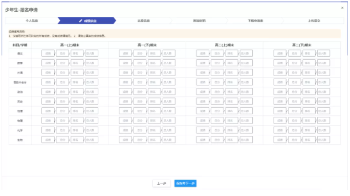 3.填写所在学习阶段的成绩,没有成绩请填无,没有排名请选0,确认无误后点击“保存并下一步”。
