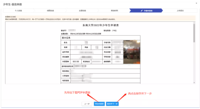 6.核对申请表信息(注:是否服从调剂一栏系统默认为“否”),无误后点击“导出申请表”并打印,点击“保存并下一步”。