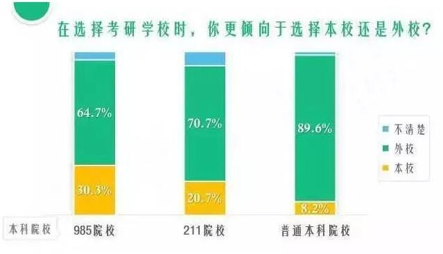 在有考研意向的学生中,学校水平越高,报考外校的比例就越低,985/211高校在选择考研学校时,倾向于选择本校的比重比普通本科院校高出10-20个百分点。