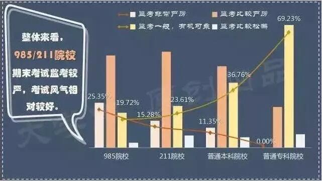 985/211高校的监考秩序细则一般比普通本科及专科院校要严格,考试风气较好,同时学生对于考试作弊现象的容忍度更低。