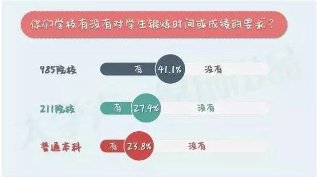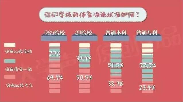 从图表中明显可以看出,水平越高的院校对学生体育锻炼的要求也越高,同时学校的体育设施的建设和维护情况就越好。985院校有三分之二的学生认为自己学校的体育设施比较齐全,基本能满足学生使用的需求,则国内绝大部分普通本科院校体育设施的建设水平不容客观,甚至有15%的学生认为自己学校的体育设施比较烂。
