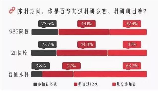 985/211高校学生参与科研项目的比例实际上都不低,仅有不到三分之一的同学完全没有参与过任何科研竞赛或科研项目,有近四分之一的同学是这类活动的重度参与者。普通本科院校有近三分之二的同学表示从未参加过科研竞赛或项目,与985/211高校的学生产生了鲜明的对比。普通本科高校学生参与科研的比例之所以如此之低,最主要的原因很可能是因为学校提供的机会实在太少。而985/211高校的学生则认为科研参与门槛太高,让学生望而却步的占了多数。对985/211高校的学生来说,参与科研最主要的限制条件是天资,而对于普通本科的同学们来说,最大的限制条件是他们可参与的机会资源过于匮乏。七、关于科研