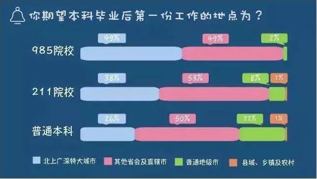 在首访的985高校学生中,近一半的同学表示自己期望的首份工作地点在北上广深这样的大城市,而普通本科学生选择这几个一线城市的比例则只有26%。而从是否愿意去县城、乡镇级农村工作的数据来看,985高校学生几乎无人愿意,即使是普通本科学校的学生也只有寥寥几位表示愿意去。