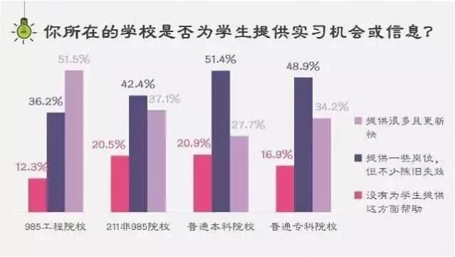 不同水平的高校在给学生提供实习机会的问题上表现相差甚远。从985/211院校到普通本科院校,能为学生提供丰富且有效的实习信息及机会的比例依次递减,而普通本科院校在这方面的水平还不如专科院校。