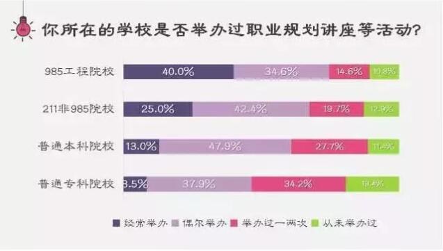 水平越高的大学越经常举办职业规划方面的讲座活动,而普通本科高校的类似活动远远无法满足学生的需求。
