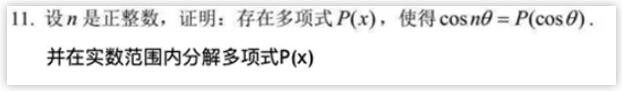 2019年 第11题这题涉及的是切比雪夫多项式,若是对切比雪夫多项式有所了解,可以直接得出答案。但实际上也可以直接用高中的方法完成答案的推导:至于在实数范围内对其进行分解,只需写出几项,讨论最高项的规律,再找出各个零点,也能简单完成: