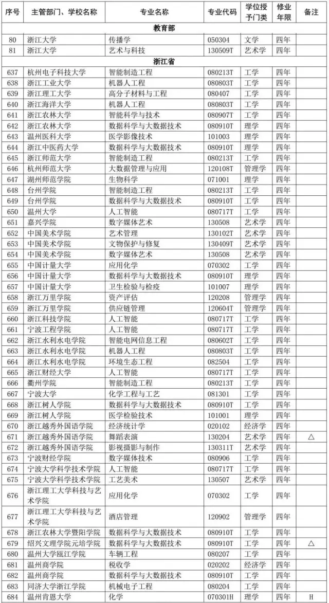 “新基建”涉及七大领域,投资巨大,需要大量的专业技术人才,必然需要与高校的专业设置相匹配,因此2020年新出台的强基计划也是为了更好地顺应这一发展趋势。以浙江省为例,在近日教育部公布的2019年度普通高等学校本科专业备案和审批结果中,浙江省内高校共获批50个备案本科专业,详见下图。其中,属于“新基建”范畴所需培养的专技术人才专业占据了大部分,例如“人工智能”、“数据科学与大数据技术”、“机器人工程”,“数字媒体技术”等专业。
