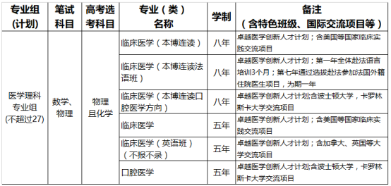 上海交通大学医学院本科招生设有临床医学八年制本博连读(含方向)的长学制专业,有临床医学(含方向)、口腔医学、儿科学、预防医学、生物医 学科学、医学检验技术、护理学、食品卫生与营养学等本科专业。其中,临床医学、口腔医学、医学检验技术、护理学专业为教育部特色专业;临床医学八年制(法文班)、儿科学(“5+3”一体化培养)与临床医学五年制(英语班)是医学院的特色班级。