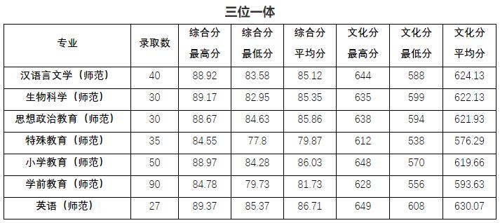 上图为浙江师范大学2019年三位一体录取和普通类录取数据,在7个三位一体招生专业中,学前教育(师范)专业通过三位一体渠道录取的学生数量甚至超过了普通类高考录取数。以此专业为例,对比三位一体录取平均分(593.63分)和高考裸考录取平均分(618.4分),三一录取平均分低了24.77分,三位一体报考优势最大程度上还是体现在了较低录取分上。