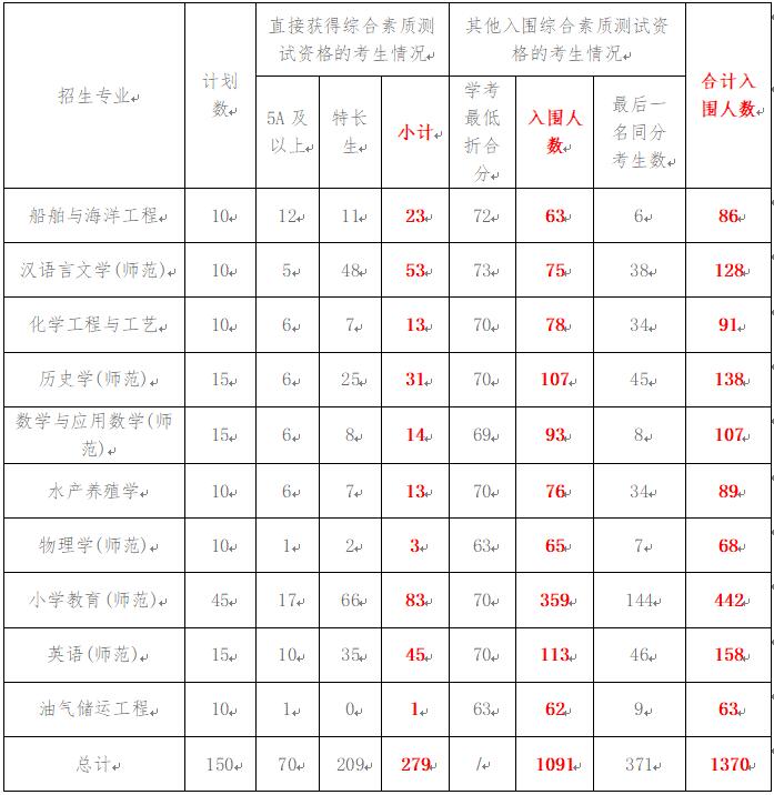 浙江海洋大学2019年三位一体综合评价招生直接入围综合素质测试的考生名单已公示,于昨天已完成确认缴费工作,本校将于2019年4月14日开展综合素质测试。从今年浙江海洋大学的三一初审情况来看,一共有1370人通过书面评审,获得参加综合素质测试的资格。其中279位考生(学考成绩5A及以上考生70人;满足学校章程规定专项条件之一的考生209人)符合优先直接获得三位一体综合素质测试资格,不占通过书面评审的人数比例。其他通过书面评审考生根据学考成绩折算分从高分到低分专业计划数6倍获得三一综合素质测试资格,最后一名同分考生一并入围,共计1091人,具体如下: