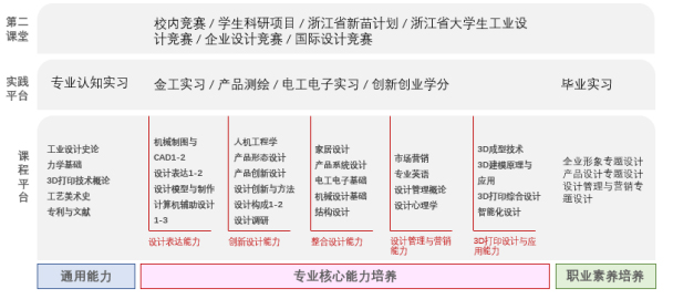 本专业旨在培养在机电装备、家用电器、交通工具、文体用具、文化创意等产业领域内中小企业中从事产品设计、设计管理、产品营销等方面工作的高素质应用型人才。在人才培养过程中,本专业CDIO的工程教学理念,运用项目化教学方法,建立“理论课程平台—实践平台—第二课堂”三层次立体化的培养模式,对学生的专业核心能力进行系统性、综合性、应用性的培养。