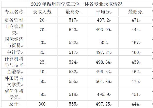 回顾2019年温州商学院三位一体综合评价招生,志愿填报共计1006人,最终录取新生300人。在录取的300名考生中,有180名考生高考成绩达到二段线(496分)以上,录取的考生中高考成绩最高分为555分,平均分497.25分。从下表各三位一体专业录取情况中可以看出,温州商学院外国语言文学类专业的录取分数最高,工商管理类专业最低。