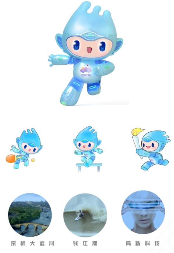 “宸宸”从大运河走来,游向钱塘江,游向世界。全身以科技蓝为主色调,头顶举世罕见的钱江潮,额头嵌以拱宸桥的图案,给人以无穷的想象。
